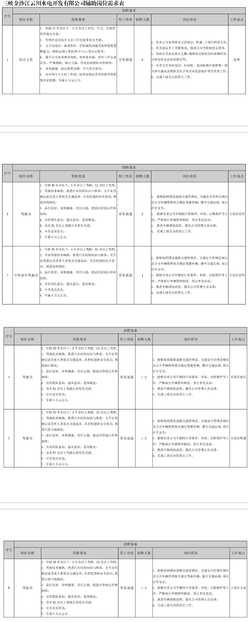 一、招聘崗位及要求(詳見(jiàn)三峽金沙江云川水電開(kāi)發(fā)有限公司輔助崗位需求表)