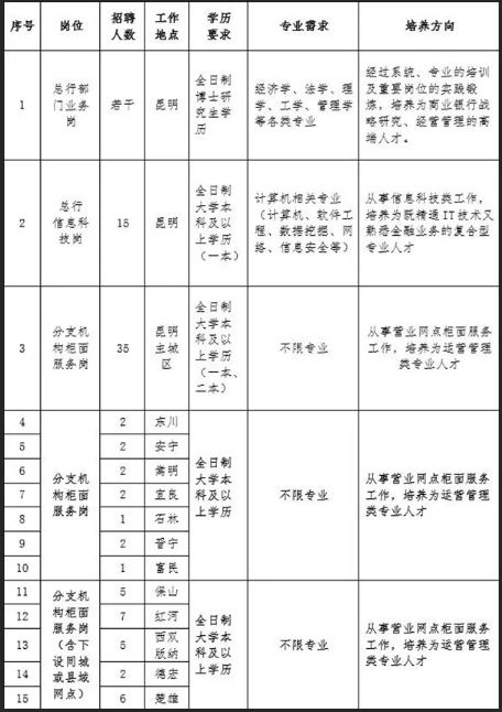 富滇銀行倡導和堅持“以人為本”的人才理念,積極為應(yīng)屆畢業(yè)生提供有競爭力的薪酬、完善的福利、專業(yè)的培訓體系、廣闊職業(yè)晉升通道和發(fā)展平臺。根據(jù)業(yè)務(wù)發(fā)展需要,富滇銀行啟動2019年校園招聘,現(xiàn)將有關(guān)事項公告如下: