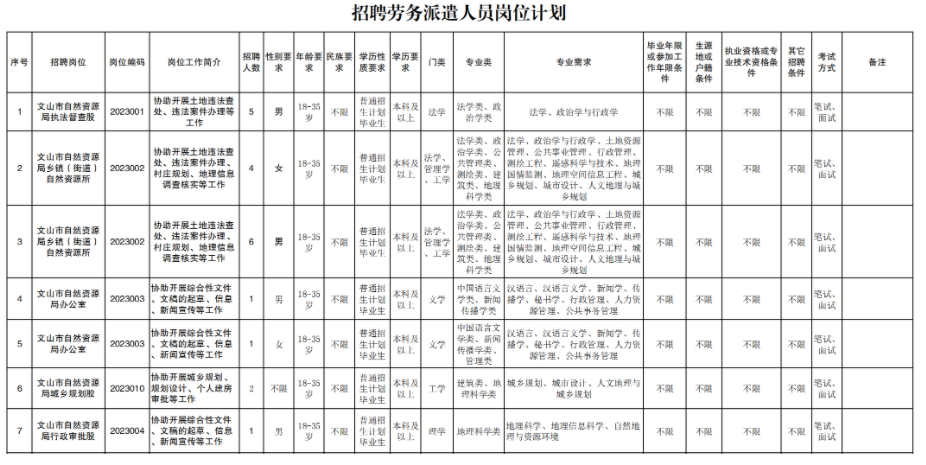 公開招聘人員20名。具體崗位、人數、資格條件等詳見《文山州財信人力資源有限公司公開招聘勞務派遣人員崗位計劃》(以下簡稱《崗位計劃》),報考人員可通過“文山人才網”微信公眾號、文山人才網、“文山市城鄉(xiāng)投”公眾號查看招聘信息。