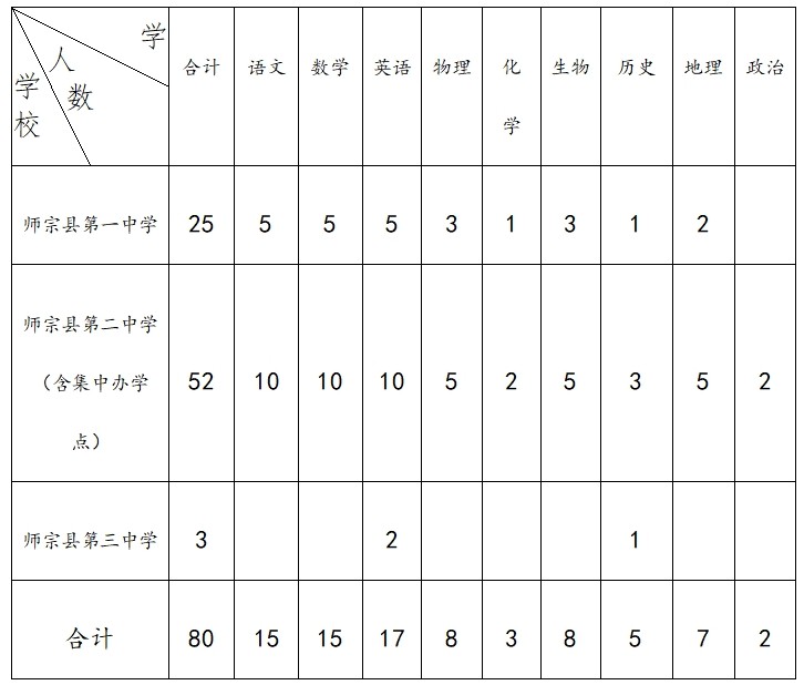 為加強師宗縣教師隊伍建設,經(jīng)縣委、縣政府同意,曲靖市師宗縣教育體育局決定面向全國師范大學類本科大學(不包含師范類學院)(名單見附件1)2020年畢業(yè)的優(yōu)秀學生,公開招聘中學教師80名,現(xiàn)公告如下。