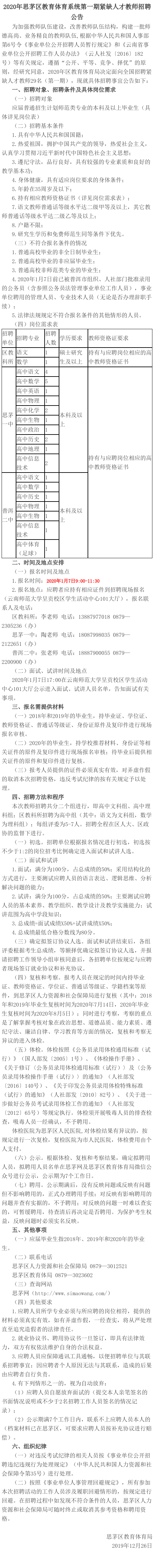 2020年普洱市思茅區(qū)教育體育系統(tǒng)第一期緊缺人才教師招聘公告