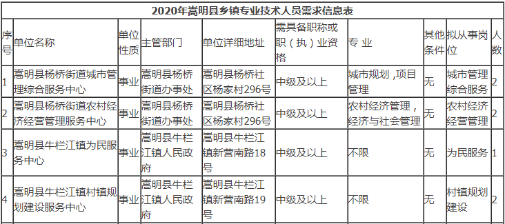 昆明市嵩明縣人力資源和社會保障局關(guān)于2020年鄉(xiāng)鎮(zhèn)基層專業(yè)技術(shù)人員需求信息的通告